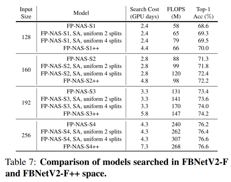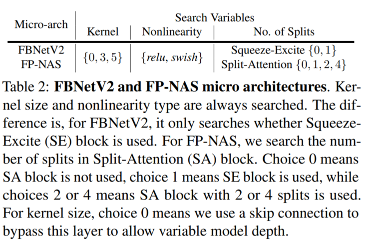 为了证明所提方法的搜索效率,作者扩展了微体系结构,在MBConv块中将SE Module替换为Split-Attention(SA),并将其表示为FP-NAS微体系结构(Tabel 2第2行);