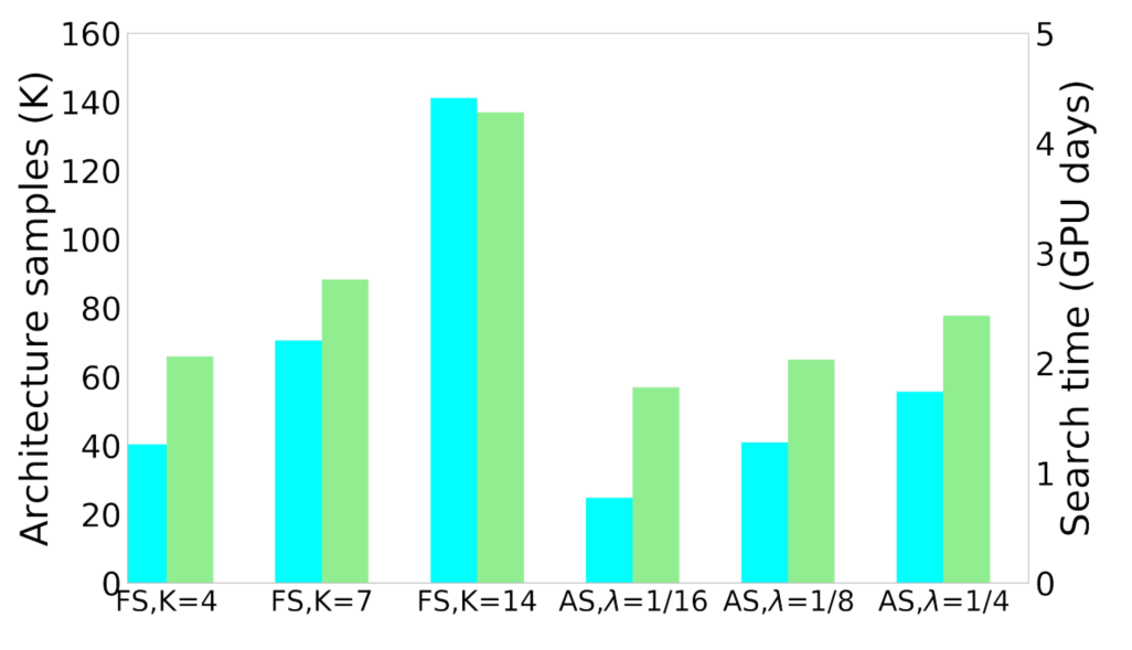从上图可以看出,更大的K样品更多的架构,而分布熵降低更明显,这就意味着学习体系结构的分布是更有效。