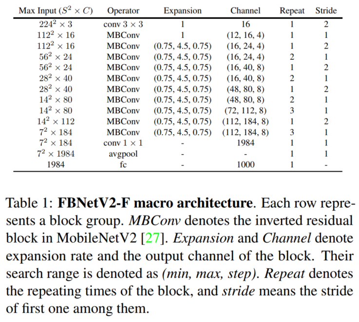 本文的大部分消融实验都在这个空间下进行的,其宏观架构定义在Tabel 1,微观架构定义在Tabel 2的第1行。它有多个搜索变量,包括卷积核大小、非线性类型、SE Block的使用、Block扩展率、Block特征通道,包含 种不同架构。