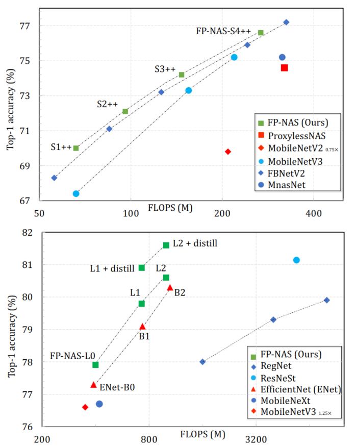 上表将FP-NAS模型与其他模型进行了比较。FP-NAS模型比其他模型显示了更好的ATC权衡。在上表中还比较了使用和不使用就地蒸馏的BigNAS模型。对于小型模型,FP-NAS-S4++不蒸馏已经和BigNAS-S模型的inplace distillation有相当的性能了。对于大型模型,基于vanilla distillation的FP-NASL2可以超越inplace distillation的BigNAS-XL大约0.7个百分点,但是基于vanilla distillation的FP-NASL2具有更低的FLOPS。