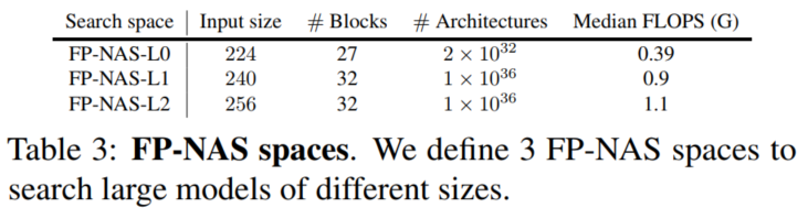 通过结合扩展的宏架构和FP-NAS微架构得到了3个大的FP-NAS空间,其中包含了不同大小的模型供搜索。还使用FP-NAS-L表示从这些空间搜索的模型。