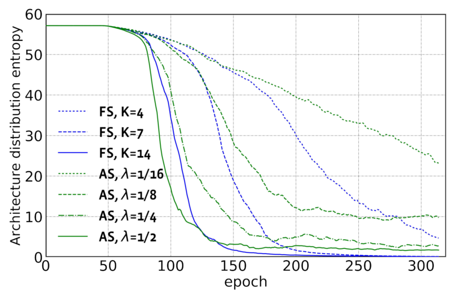 本文提出了一种简单而有效的自适应于结构分布学习的抽样方法。在搜索过程中调整了结构样本的大小 与 的熵成比例。在搜索的前期,熵值很高促使更多的探索。之后,熵的减少作为一个候选操作子集被认为是更有价值的,并且抽样可能更偏向于他们。具体来说: