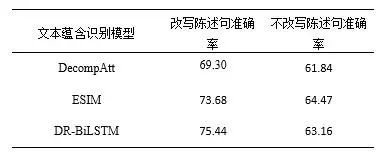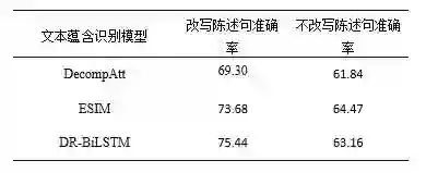 我们在三种文本蕴含识别模型上进行了词汇级答案验证的实验,同时为了说明我们进行问句-陈述句转化的必要性,我们进行了不进行陈述句转化的对比实验,具体结果如表3所示。其中DecompAtt代表分解注意力模型,ESIM代表增强序列推断模型,DR-BiLSTM代表依赖阅读双向LSTM模型。