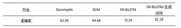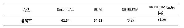 我们亦采用词汇级答案验证使用的三种文本蕴含识别模型进行句子级答案验证的实验,同时为了验证我们采用的利用问句生成辅助句子级答案验证的有效性,我们进行了不融入生成问句和融入生成问句的对比实验,具体结果如表 4所示。其中DecompAtt代表分解注意力模型,ESIM代表增强序列推断模型,DR-BiLSTM代表依赖阅读双向LSTM模型,DR-BiLSTM+生成问句代表依赖阅读双向LSTM模型融入生成问句和原始问句间蕴含关系的结果。