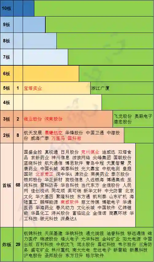 图中标的剔除新股和ST,绿色背景为炸板或进阶失败个股,其他颜色背景为对应高度涨停个股。红色字体为主观选择的对应高度核心股,每个高度不超过三只,便于观察市场情绪变化和结构走向,非投资建议。