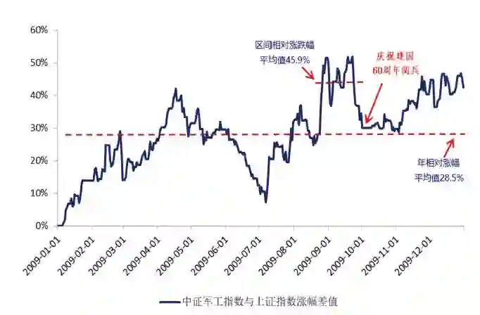 【2009年中证军工指数与上证指数涨幅差值】