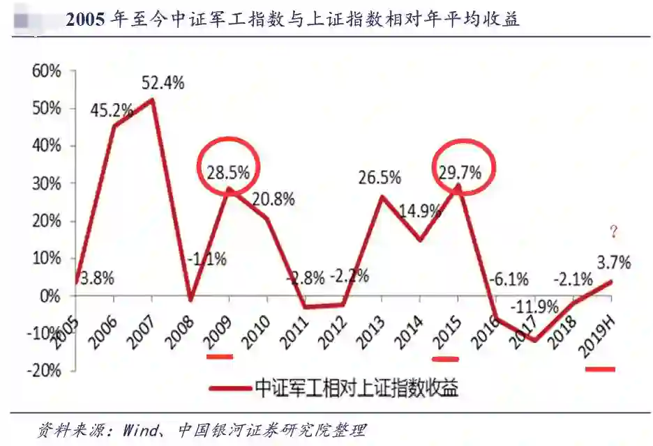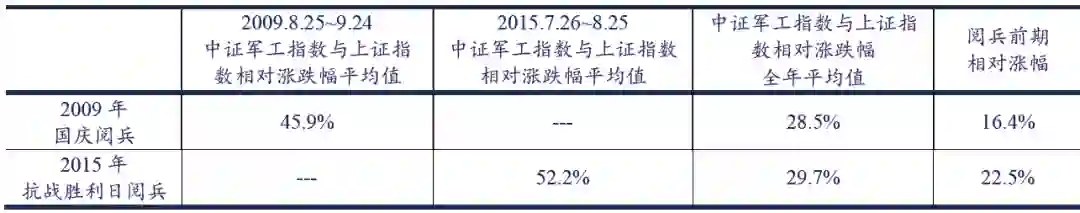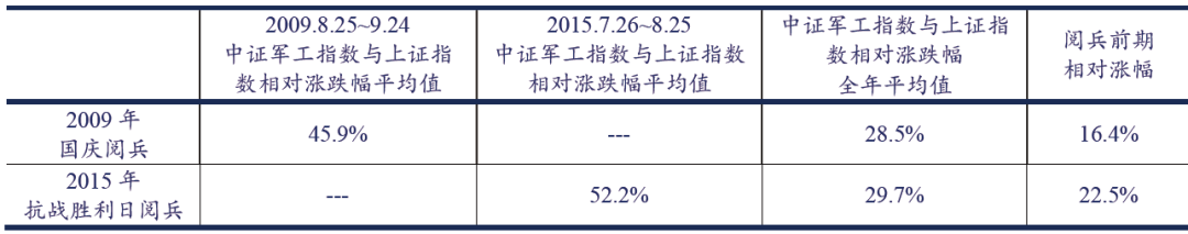 从2009年和2015年两个阅兵年情况来看,受阅兵影响,中证军工指数相对上证指数全年涨幅分别为28.5%和29.7%,均达到局部高位,说明阅兵对军工板块提振作用明显。