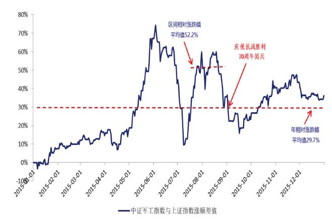 【2015年中证军工指数与上证指数涨幅差值】