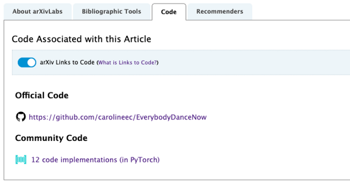 预印本存储库为研究人员提供了一种分享他们工作的方式,在经历漫长的同行评审过程之前,放到著名学术期刊上进行实践。在 arXiv 上分享的代码将通过带有代码的论文提交,并且可以在每篇论文的「Code」标签中找到。