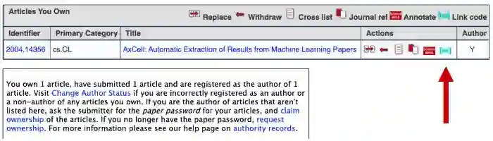 作者可以通过访问 arXiv. org/user,点击带有「Code」图标的「Link to code」 ,将官方代码添加到 arXiv 论文中,它将跳转到Papers with Code,在那里他们可以添加他们的代码。一旦他们添加了官方实现,官方代码部分将显示在 arXiv 文章页面上。