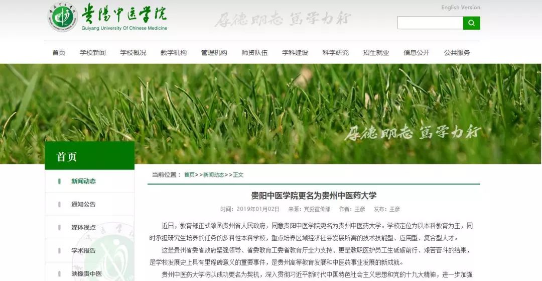 据贵阳中医学院官网消息,近日,教育部正式致函贵州省人民政府,同意贵阳中医学院更名为贵州中医药大学。学校定位为以本科教育为主,同时承担研究生培养的任务的多科性本科学校,重点培养区域经济社会发展所需的技术技能型、应用型、复合型人才。