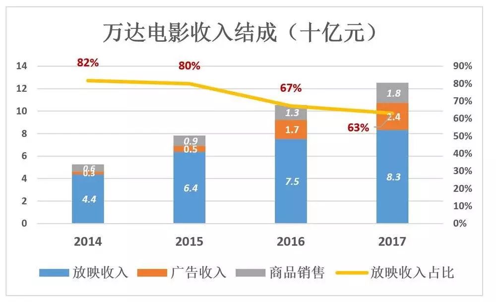 2014年以来,电影放映收入占比持续降低,2017年放映收入83亿,占总营收的63%。而在2014年,这个比例高达82%。