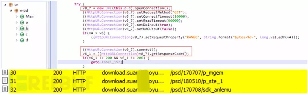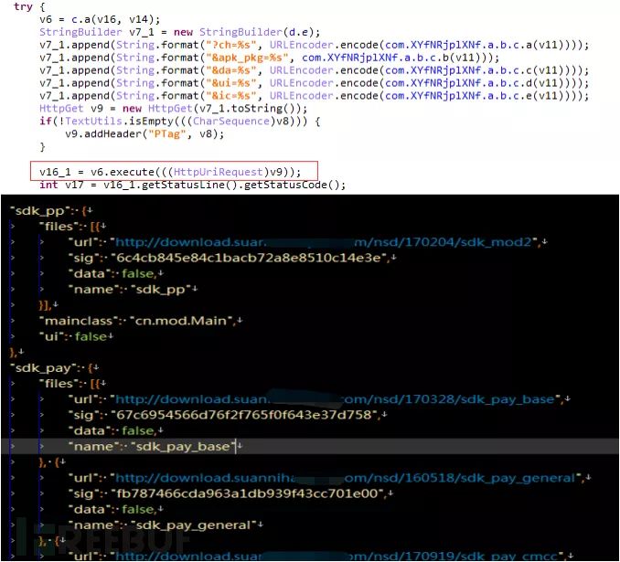 3.2初始化插件的过程中,com.XYfNRjplXNf.a.c$1的run()方法会链接云端服务器,下载云端配置文件,解密以后获取到相应dex子包的下载地址