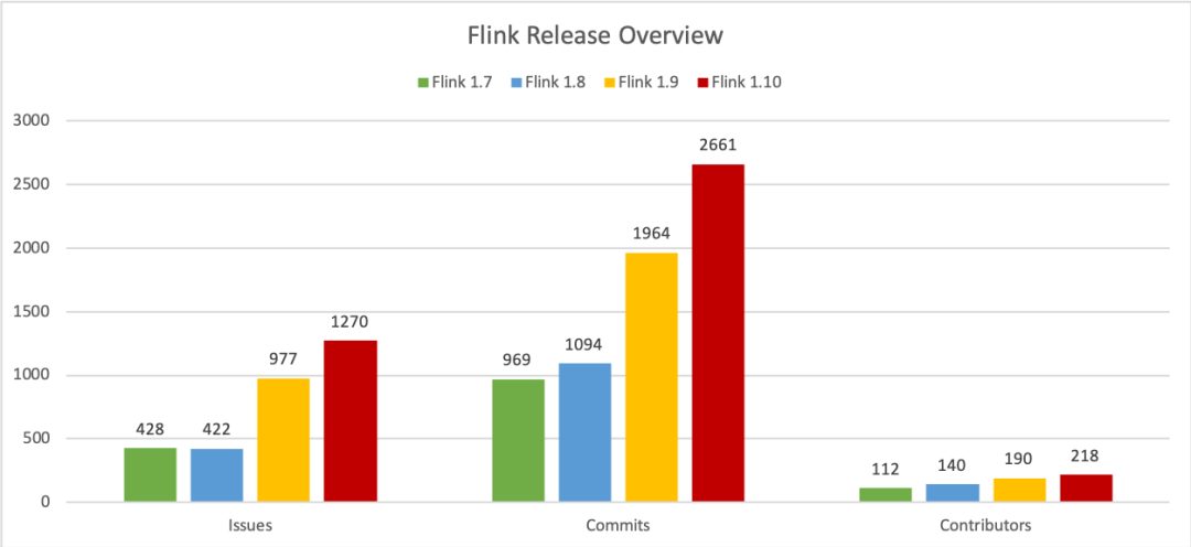 Flink 1.10.0 版本一共有 218 名贡献者,解决了 1270 个 JIRA issue,经由 2661 个 commit 总共提交了超过 102 万行代码,多项数据对比之前的几个版本都有所提升,印证着 Flink 开源社区的蓬勃发展。