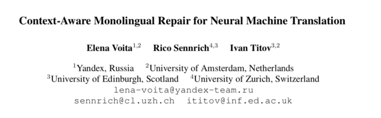 参考文献[1] Voita, Elena, Rico Sennrich, and Ivan Titov. "Context-Aware Monolingual Repair for Neural Machine Translation." arXiv preprint arXiv:1909.01383 (2019).[2] Vaswani, Ashish, et al. "Attention is all you need." Advances in neural information processing systems. 2017.[3] Hassan, Hany, et al. "Achieving human parity on automatic chinese to english news translation." arXiv preprint arXiv:1803.05567 (2018).[4] Voita, E., Serdyukov, P., Sennrich, R., & Titov, I. (2018). Context-aware neural machine translation learns anaphora resolution. arXiv preprint arXiv:1805.10163.[5] Zhang, J., Luan, H., Sun, M., Zhai, F., Xu, J., Zhang, M., & Liu, Y. (2018). Improving the transformer translation model with document-level context. arXiv preprint arXiv:1810.03581.[6] Xiong, H., He, Z., Wu, H., & Wang, H. (2019, July). Modeling coherence for discourse neural machine translation. In Proceedings of the AAAI Conference on Artificial Intelligence (Vol. 33, pp. 7338-7345).[7] Voita, E., Sennrich, R., & Titov, I. (2019). When a Good Translation is Wrong in Context: Context-Aware Machine Translation Improves on Deixis, Ellipsis, and Lexical Cohesion. arXiv preprint arXiv:1905.05979.
