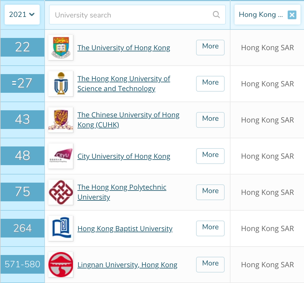 此外,入围榜单的香港高校中,香港大学位列第 22 名,香港科技大学位列第 27 名,香港中文大学第 43 名。详情参见下表: