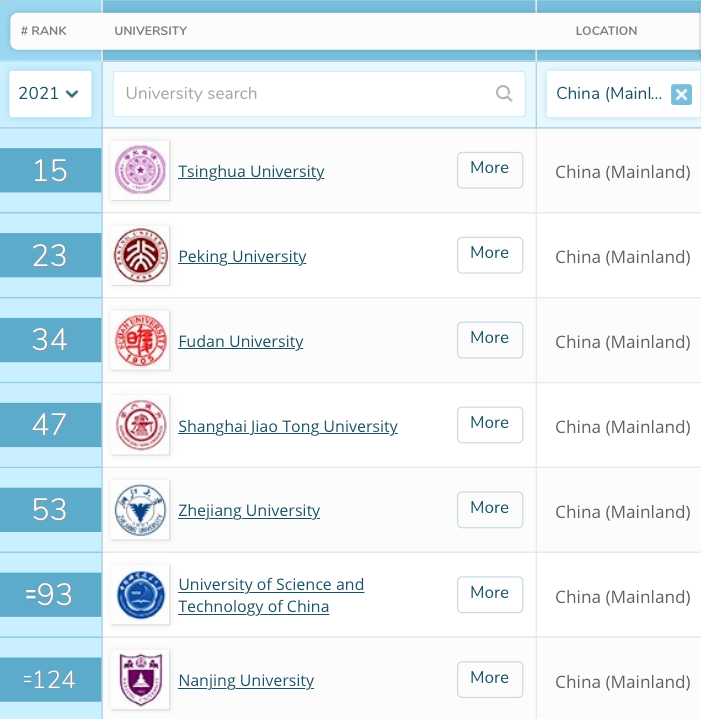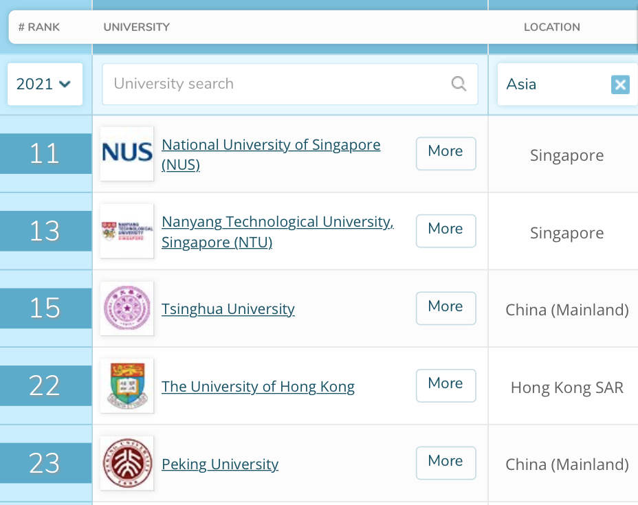 亚洲地区排名靠前的几所院校分别为新加坡国立大学(第 11 名)、新加坡南洋理工大学(第 13 名)、清华大学(第 15 名)、香港大学(第 22 名)、北京大学(第 23 名)。