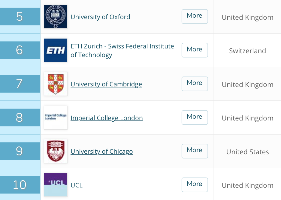 欧洲地区排名第一位的是英国牛津大学,同时进入世界前十名的英国院校还包括剑桥大学(第 7 名)、伦敦帝国理工学院(第 8 名)和伦敦大学学院(第 10 名)。在欧洲地区排名第二位的高校是瑞士的苏黎世联邦理工学院。