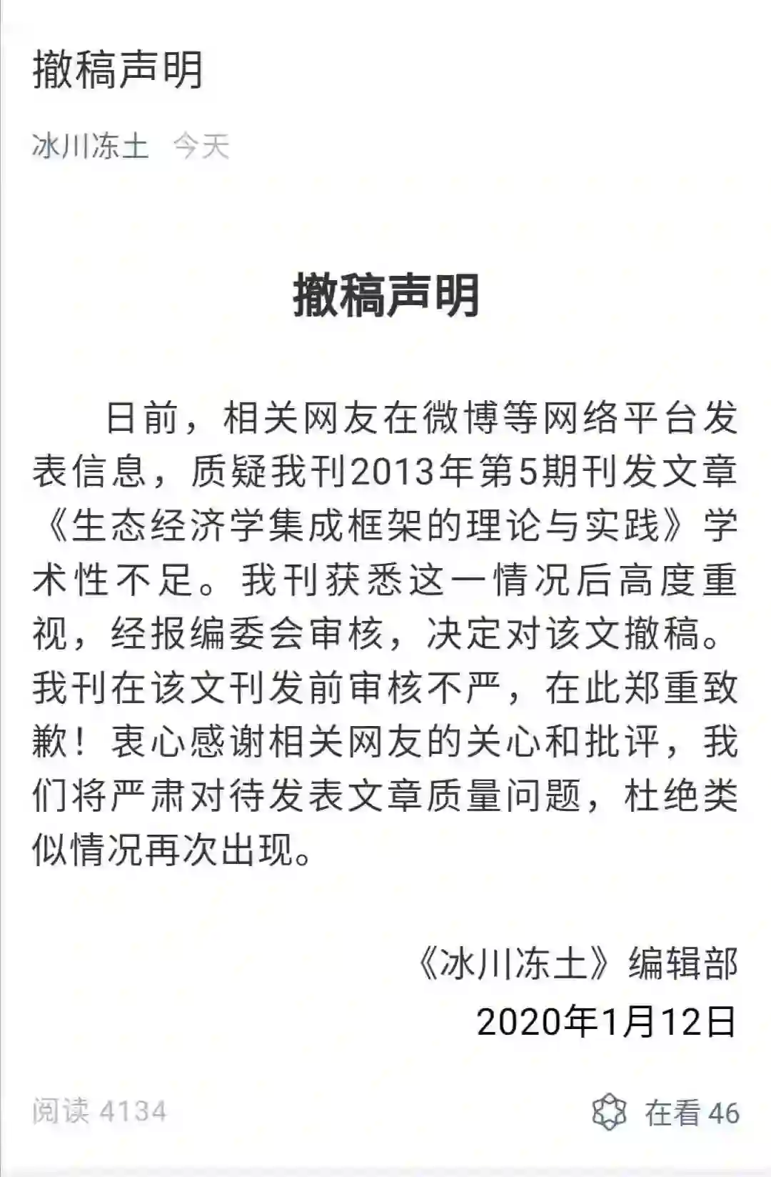 1月12日中午,《冰川冻土》期刊编辑部宣布撤稿,“经报编委会审核,决定对该文撤稿。我刊在该文刊发前审核不严,在此郑重致歉。”