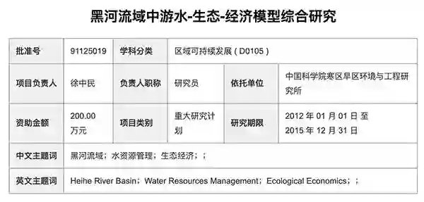 据冰点周刊公号,根据众多学者论文和中科院寒区旱区科学数据中心等公布的信息,编号为“91125019”的基金项目,指的是“黑河流域中游水-生态-经济模型综合研究”项目,属于国家自然科学基金“黑河流域生态-水文过程集成研究”重大研究计划下的重点项目之一。2010年启动的这项重大研究计划,被称为“黑河计划”,程国栋院士担任“黑河计划”专家组组长。2014年,程国栋院士及其团队发表关于黑河集成研究的综述文章,作者就包括徐中民研究员。