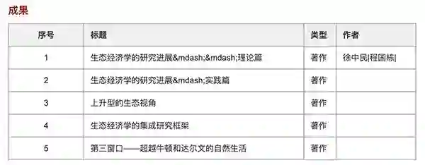 该项目成果包括五方面:生态经济学的研究进展,理论篇;生态经济学的研究进展,实践篇;上升型的生态视角;生态经济学的集成研究框架;第三窗口——超越牛顿和达尔文的自然生活。其中,《理论与实践(I)》、《理论与实践(II)》这两篇论文属于“生态经济学的集成研究框架”成果。