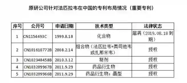 专利方面,早在 1999 年 8 月 18 日,富山化工就在中国对法匹拉韦进行了化合物专利申请。后来,自 2008 年至 2011 年,法匹拉韦的原研公司在中国还申请了中间体、组合物、制备方法、制剂、药品衍生物等外围专利。