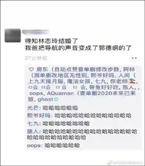 有网友在朋友圈里调侃,“得知林志玲结婚了,我爸把导航语音换成郭德纲的了”,引发了不少共鸣,还被不少网友转发;还有网友发微博“我默默的把离线语音设置成了@罗永浩老师的声音”,罗永浩转发该微博称“别这样,我也结婚了……你还是改回林志玲吧。其实……听声音听不出来她结没结婚。想开点儿,我们一起祝她幸福吧。”