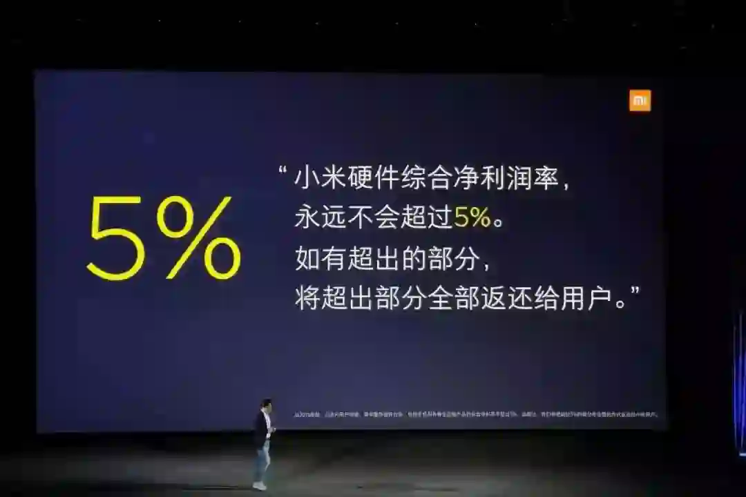 “从现在起,小米正式向用户承诺,每年整体硬件业务,(包括手机及IoT和生活消费产品)的综合税后净利率不超过5%。如超过,我们将把超过5%的部分用合理的方式返还给小米用户。”