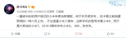 小米将于本月底发布旗舰新机小米7的消息现已传开,对于米粉而言,每一代正统小米手机推新品,必将受到更高的关注,不过今年正好适逢小米八周年,所以近日有相关人士透露称,小米手机7实际型号命名为小米手机8,目的很明确,就是为了迎合小米八周年成为一个纪念。