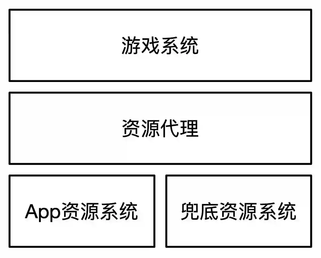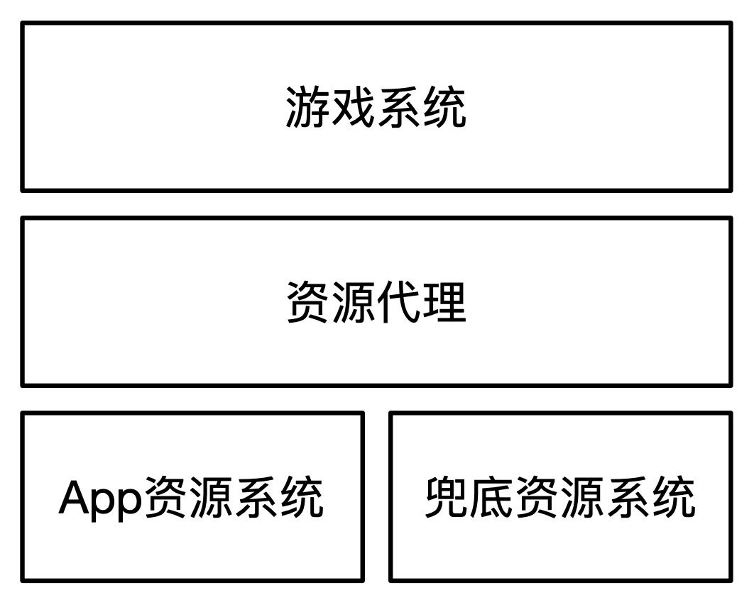 资源系统架构如图4-6所示,在游戏系统和资源系统中间增加了一层代理,兼容APP资源系统和兜底资源系统。