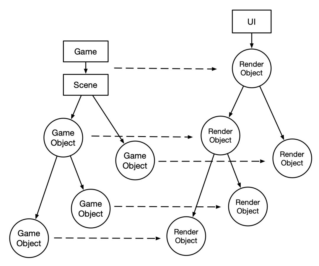 首先是Game的对象数和Flutter的三颗树有效融合,所以每一个GameObject必须对应一个Widget、Element和RenderObject。