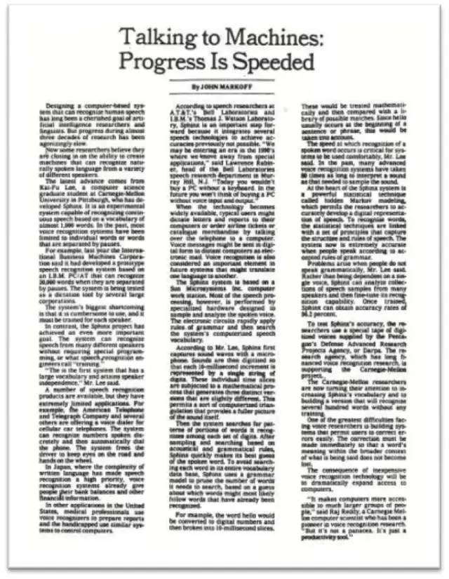 会后,《纽约时报》派记者John Markoff来到匹兹堡对我作了采访,文章发表于1988年7月6日,占了科技版首页的整个半版。在这篇文章里,马可奥夫大力报道了我的论文的突破。当时,我只觉得在和一个和蔼可亲的记者聊天,事后,我才知道这是一名才华横溢的著名记者,三次提名普利策奖,并在斯坦福兼教。