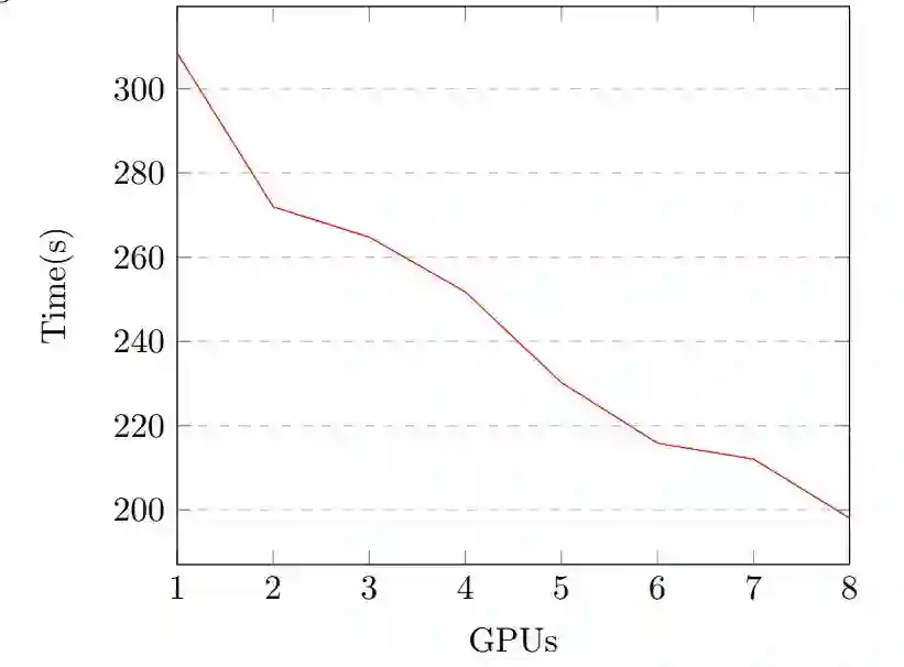 图 2:XGBoost 在 Airline 数据集上的运行时间:1-8 块 V100 GPU。