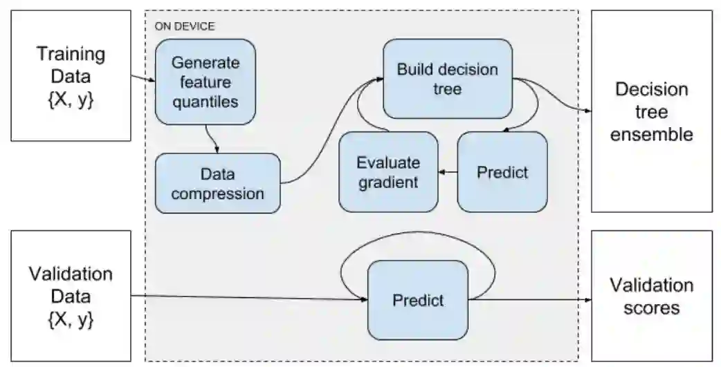 监督梯度提升将标注的训练数据集作为输入,并反复定义一系列树来渐进改善目标函数的准确率。图一在更抽象层面上展示了这一过程,我们在一个或者多个 GPU 上实现了这些重要的运算。