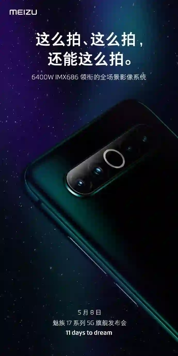 魅族后置四摄主摄为 6400 万像素, IMX686 的全场景影像系统。顺便还透露了暮光森林的配色。