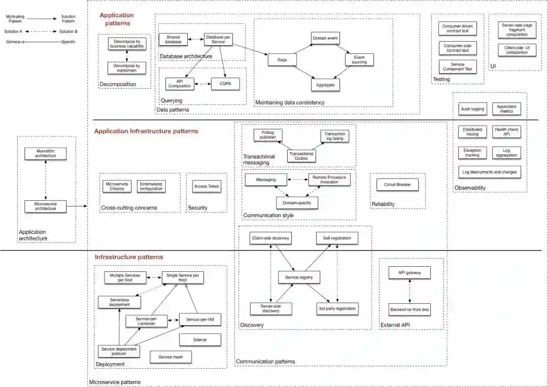 严格的说,Chris Richardson 的“单体架构模式“是一种对现状的和举例,并没有给出其特征和方法的描述,因此不能称之为模式。而”微服务架构模式“则又是一系列模式的总和,如下图所示: