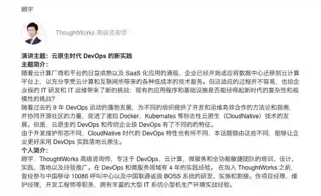 看完此文,才发现“微服务”概念有这么长的“纠缠史”,看看 ThoughtWorks 高级咨询师顾宇老师在 DOIS 2018 · 深圳站的精彩议题(这是一个当下极具吸引力的话题):云原生时代 DevOps 的新实践。