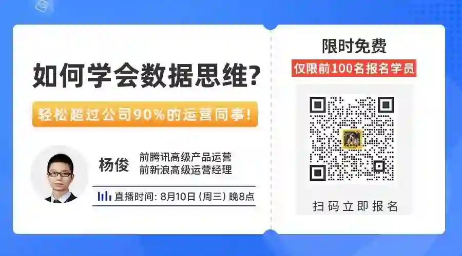 8月10日(周三)晚上8点,拥有16年运营经验@杨俊老师在线直播,用1小时教你如何锻炼数据思维,提高核心竞争力!!