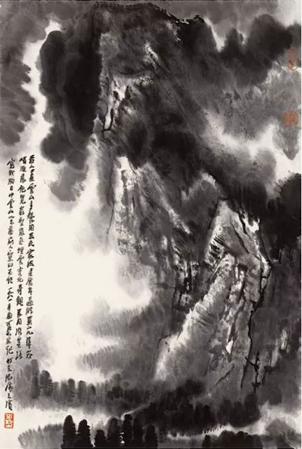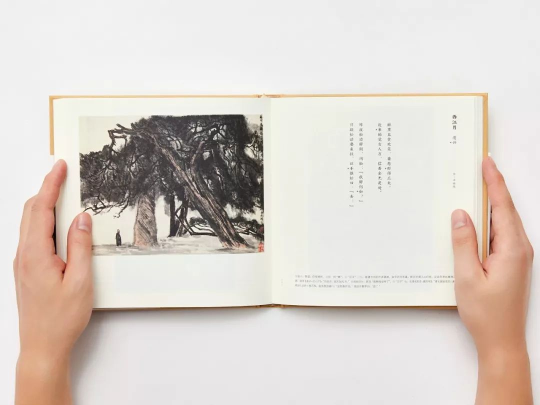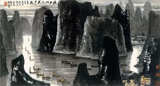李可染的山水画重视意象的凝聚,将光引入画面,尤其善于表现山林晨夕间的逆光效果,使作品具有一种朦胧迷茫、流光徘徊的特色。搭配气势恢宏的豪放词,非常合适。