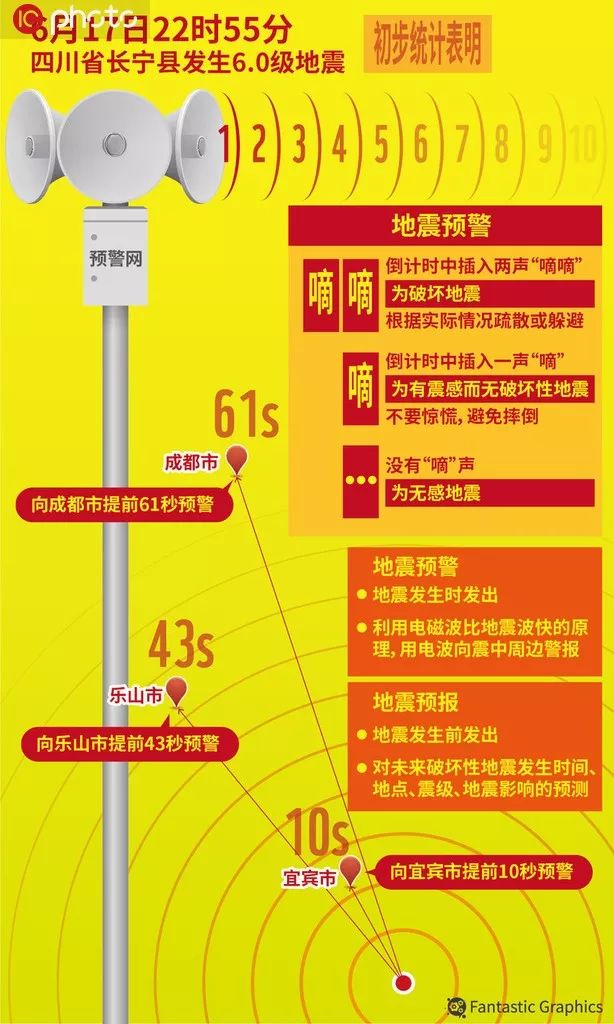 在本次宜宾地震灾害中,该系统已经向宜宾、乐山、成都等13个市州共79个区县的电视、成都的101个左右社区、宜宾乐山等地的200多个的学校发布了预警。在时间上,提前10秒向宜宾预警,提前61秒向成都预警。