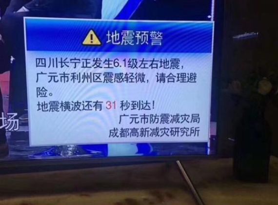 震中附近的一些宜宾、成都的民众的电视、手机、专用地震预警终端等发出预警提示:其中,大陆地震预警网为距震中51千米的宜宾市提前10秒预警,预估烈度5.2度;提前61秒向成都预警。