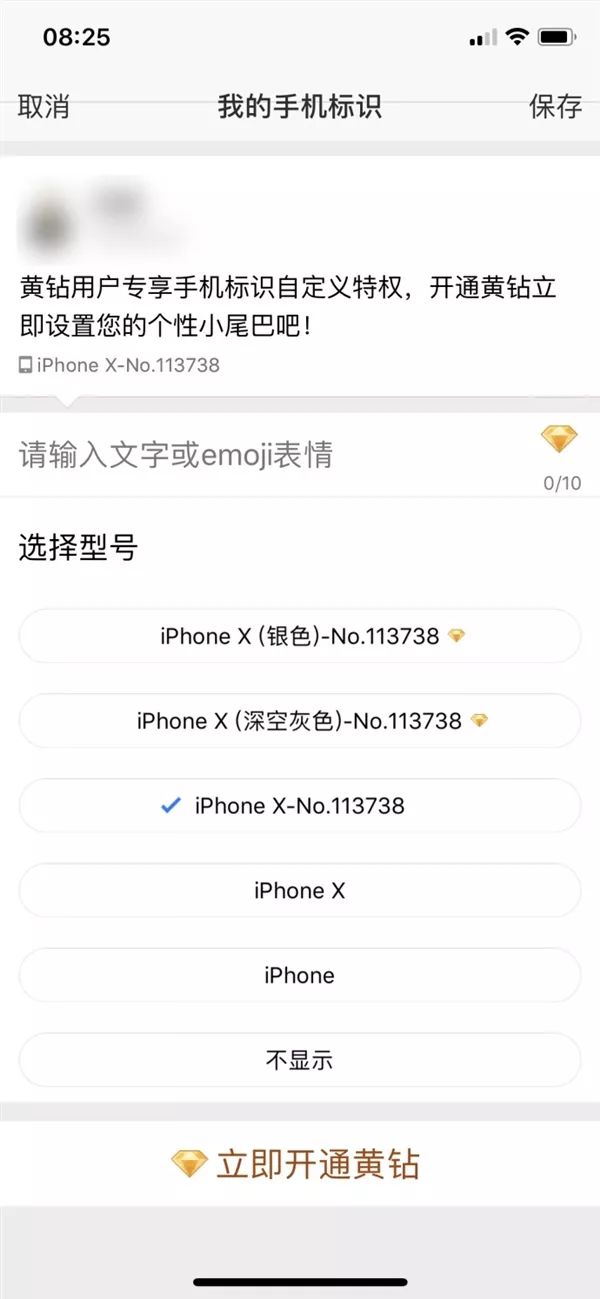 当然,和以往类似功能一样,要使用这一全新小尾巴,同时选择颜色版本的话,需要开通黄钻,没开通的话只能显示iPhone X和数字,无法显示颜色。