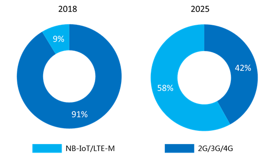 由于传统蜂窝网络仍然承载大量物联网连接,不少需要高带宽的应用需要3G/4G网络连接,加上目前2G网络产业链十分成熟、成本极低,使得2G/3G/4G在未来数年中依然是蜂窝物联网连接的主要承载设施之一,不过其增速比较缓慢,从2018年到2025年的年复合增长率仅为9.38%。而NB-IoT/eMTC则随着产业链的成熟,增长速度加快,在接下来的几年中会实现每年超过60%的增速,使得其占蜂窝物联网连接数的比例从2018年的9%快速增长到2025年的58%,成为蜂窝物联网连接的最主要载体。