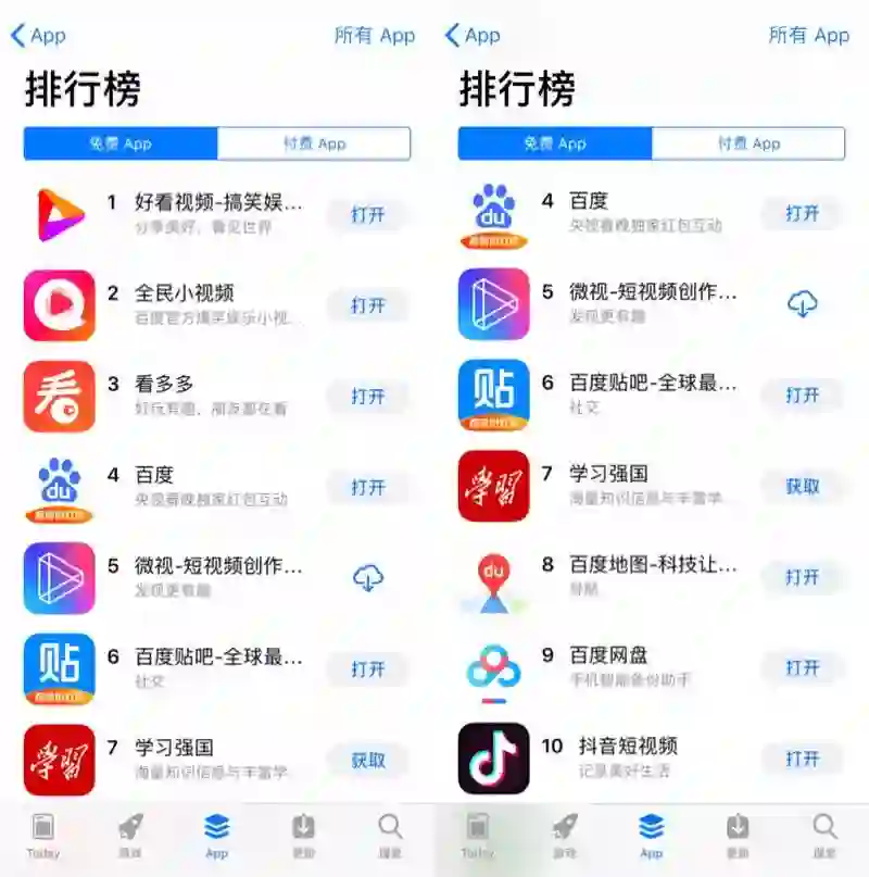 36氪讯,今年元宵节,以百度App为主的App矩阵产品发放了超过2亿元的红包,凭借央视元宵晚会影响力,今天,百度旗下好看视频登顶苹果应用商店第一名,全民小视频、看多多、百度App紧随其后,包揽苹果应用商店免费榜前4名。目前,苹果AppStore免费榜前10名的App中,有7款来自百度。
