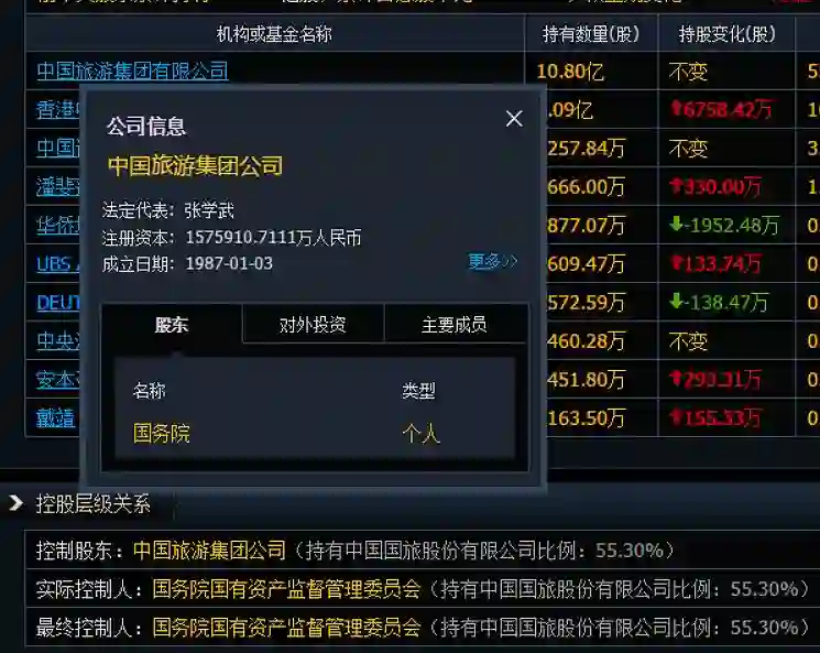 中国国旅的控股股东为国资委,是中央军里的中央军。