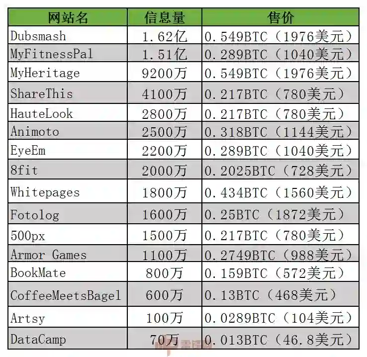 从表中我们不难看出,被兜售的网站信息量最大的是Dubsmash,为1.62亿,售价也达到了最高的1976美元。而相比之下,信息量达到1.51亿仅次第一名的MyFitnessPal售价却远不如信息量为9200万的MyHeritage。
