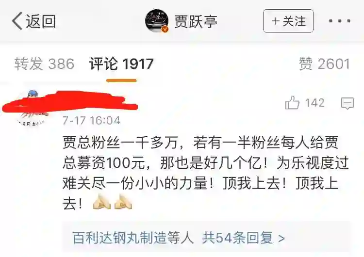 除了有网友表示愿对贾跃亭的汽车梦以实际行动支持,也有贾跃亭“铁粉”号召粉丝为贾跃亭进行捐款。近日,在贾跃亭微博留言中,有粉丝称:“贾总粉丝一千多万,若有一半粉丝每人给贾总募资100元,那也是好几亿元。”