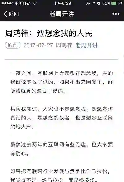 早间,一篇《人民想念周鸿祎》刷爆朋友圈,该文借“怀念周鸿祎”,指出了目前互联网圈浮躁、没人敢说真话的风气,以至于“觉得中国互联网过去两年越来越无趣了”。周鸿祎晚间在今日头条的微头条上回应称,创业阶层固化只是短期现象,长远看,任何阶层都会被打破的。创业者们不需要担心的是,站队也好,插旗子也好,都阻止不了格局被打破。互联网发展中,真正能够阻止格局被打破,或者能够打破格局的,应该是创新。