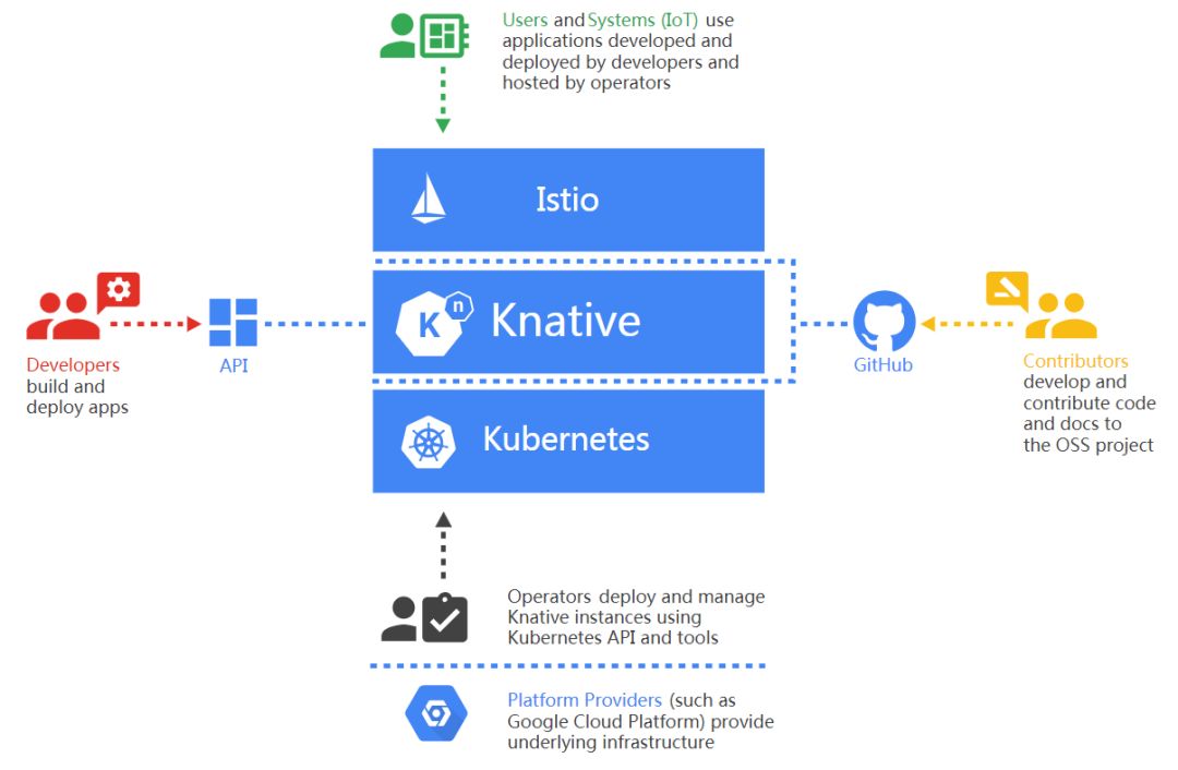 Knative建立在Kubernetes编排引擎和Istio服务网格之上,不过开发人员不需要了解这两者的复杂性,就能享受到好处。泰奇告诉与会人士:“Knative不是为最终用户设计的,它是为用户能够在其上面构建产品的基础设施部分设计的。”软件让用户无需操心在云原生环境中准备和运行应用程序的所有步骤,包括容器构建过程、编排、路由及流量管理、负载均衡及自动扩展以及服务绑定。
