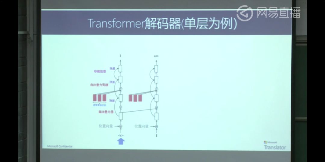 然后再做一个SoftMax,去预测这个词是什么。比如I把I的输出完之后,再把I作为一个输入,加上刚才那个句子编码(图中红色部分),也就是代表编码的隐状态也作为输入,然后再通过解码器,一层一层往上得到一个隐状态,再用SoftMax,再预测下一个词。这就是现在最标准的一个Transformer机器翻译,它的水平比传统的神经网络提高了很多。